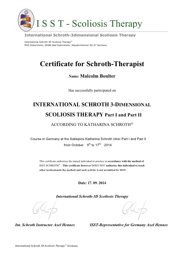 Malcolm was certified as an ISST Schroth Therapist. in 2014, authorising him to practice in International Schroth 3-Dimensional Scoliosis Therapy According to Katharina Schroth®.